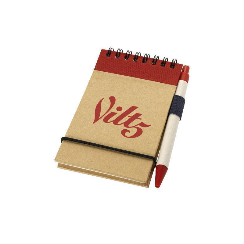 Notowanie szybkich pomysłów jest łatwe dzięki notatnikowi z recyklingu Zuse z długopisem w pasującym kolorze. Mały notatnik zawiera 40 kartek w linie z referencyjnego papieru makulaturowego A7, dzięki czemu mieści się w każdej małej lub dużej torbie, jest łatwy do trzymania, a poza tym jest to wybór zgodny z zasadami zrównoważonego rozwoju. Dostępne są różne opcje nadruku, aby umieścić dowolne logo na zewnętrznej stronie twardej okładki.