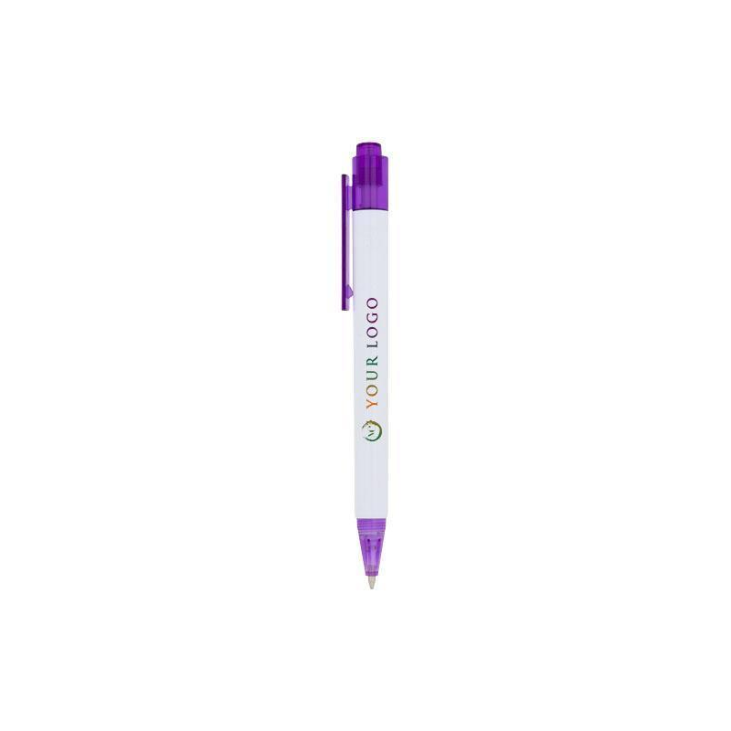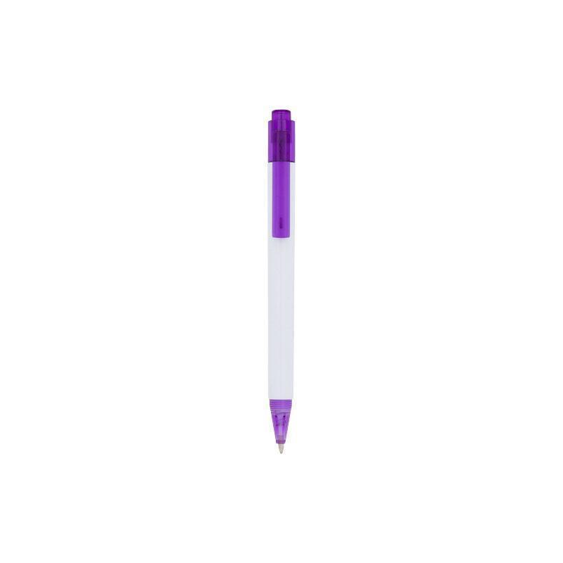 Długopis Calypso ma smukły, biały korpus i przejrzysty klips i końcówkę.