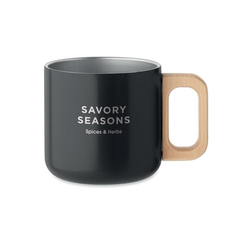 Ten elegancki czarny kubek to nie tylko naczynie na ulubiony napój, ale potężne narzędzie komunikacji marketingowej. Z charakterystycznym drewnianym uchwytem i minimalistycznym designem, staje się cichym, ale skutecznym ambasadorem Twojej marki, towarzyszącym użytkownikom przy każdym łyku kawy czy herbaty.